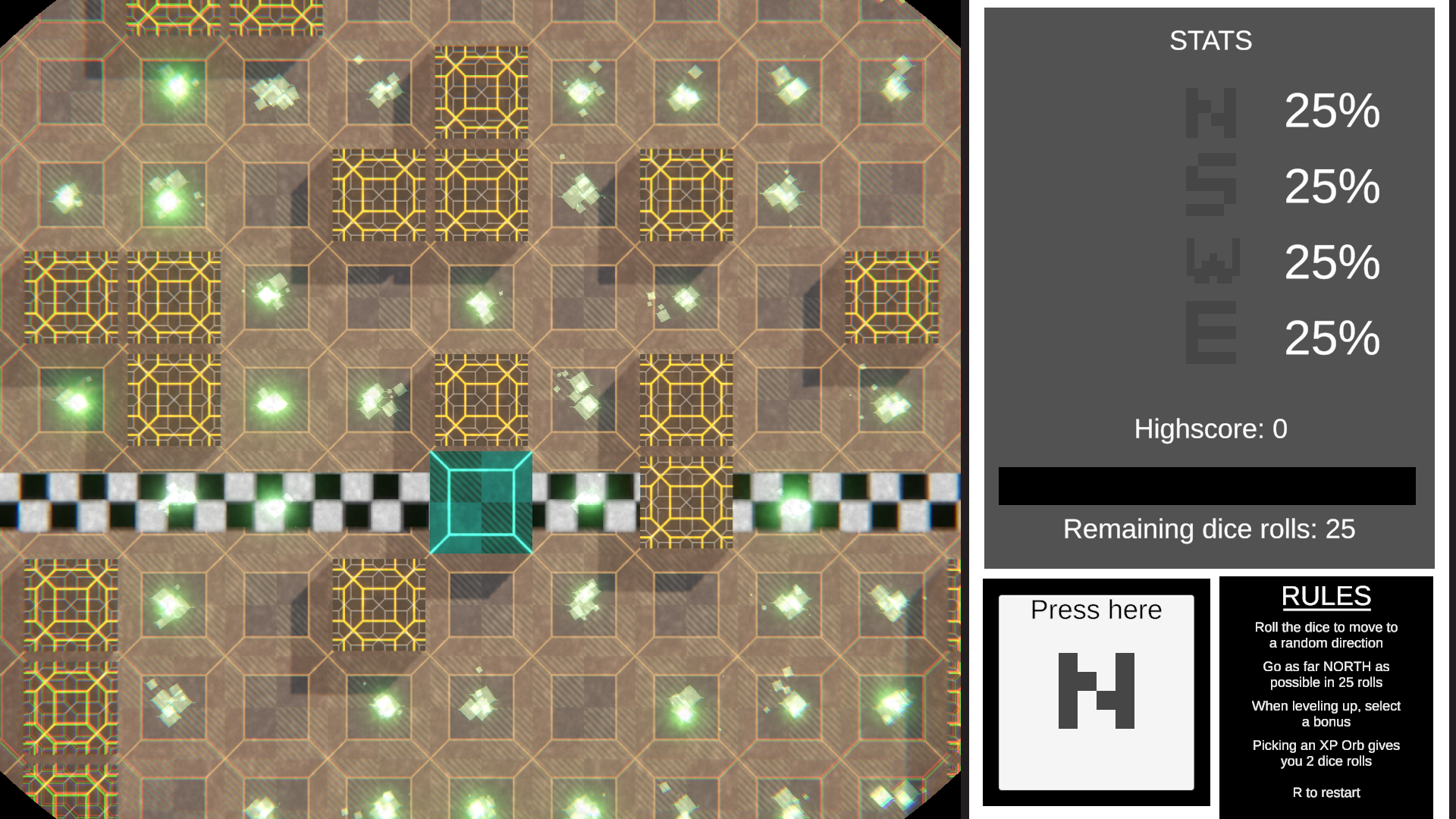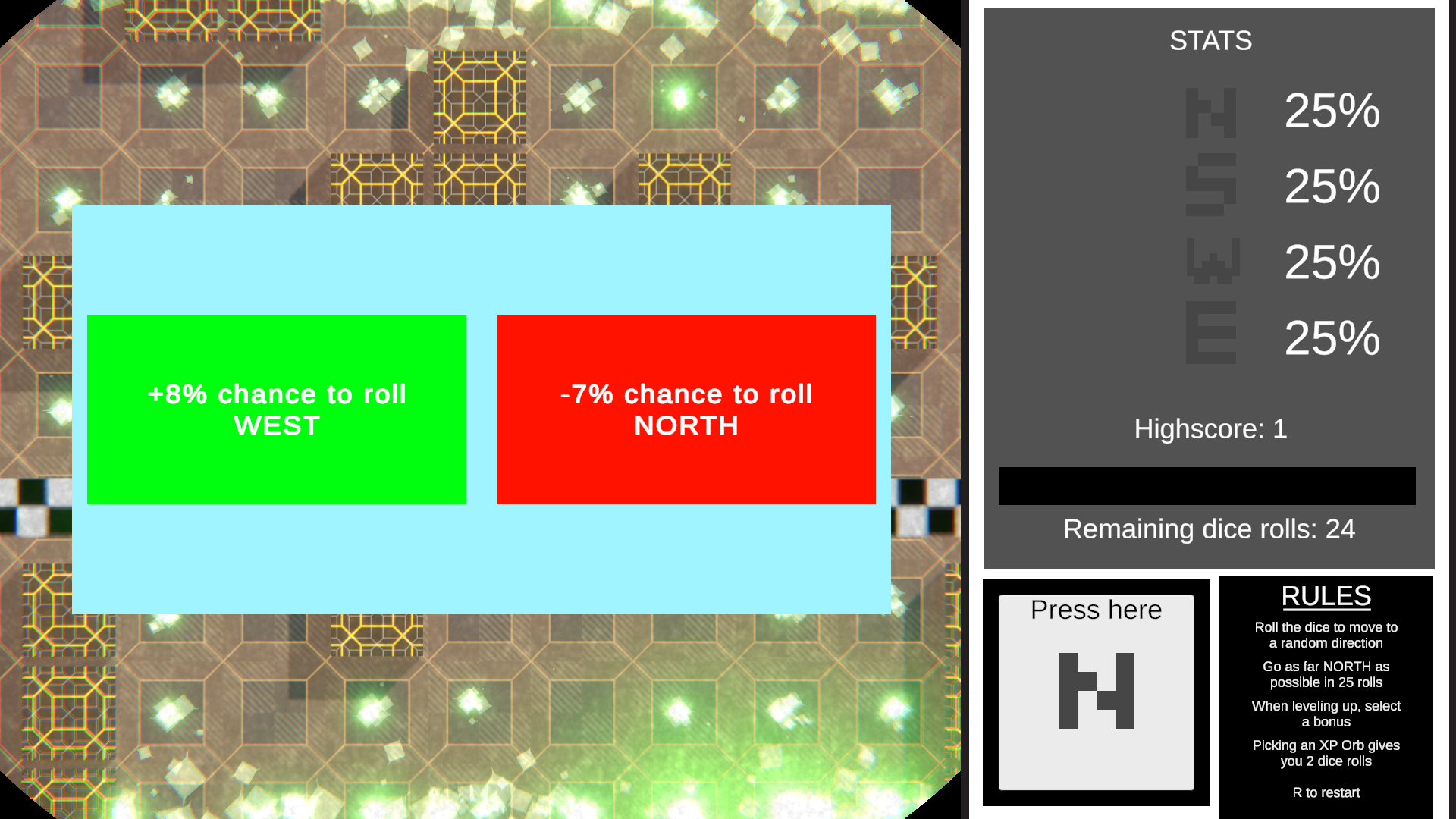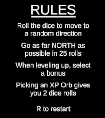North or Nothing is a roguelike-type of point-n-click game, where you try to reach as North as possible by rolling a dice that will decide for you in which direction you're going. Strategy in your choices is a must!